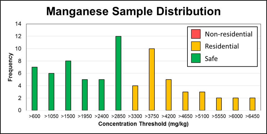 Referencing Arizona's soil remediation standards, excessive concentrations of arsenic, manganese, and vanadium were found in the soil samples. Distributions of concentrations found for each chemical are presented below.