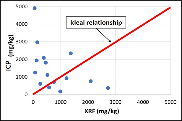 To determine the validity of the XRF analyses, a subset of samples were chosen to undergo inductively coupled plasma (ICP) analysis. How well the ICP and XRF results correlated would determine how fit all of the XRF results were for reporting purposes. A plot of the correlation can be seen below.