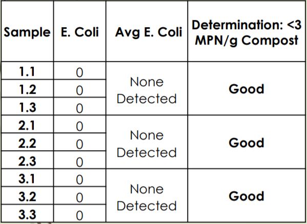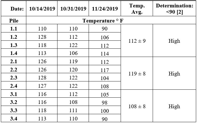 The compost sample piles have been analyzed to be mature by the external lab due to the sample being within state and federal limits for Salmonella and E. Coli [8]. The results indicate a temperature plateau between 113-128°F. Mature compost will typically cool off to less than 90°F. This is due to the organic decomposition in the compost pile being completed. Compost should maintain a temperature of 104°F for five days to kill off pathogens. This is found to be above the common range for mature finished compost. The compost piles temperatures measured were determined to be safe as long as the temperatures had previously plateaued within the compost piles.