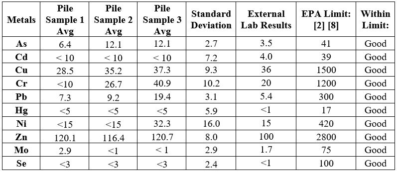 The heavy metals were tested using a subcontractor within NAU. The subcontractor tested the samples with a Portable XRF Thermo Fisher Niton XRL3 utilizing the EPA Method 6200. The samples were dried and sieved through a #60 sieve and packed into small testing cups. Four sub-samples were tested per pile. The cups were placed into the portable XRF then tested for 90 seconds. The heavy metal results are tabulated below in Table 5.3 Heavy Metal Results.