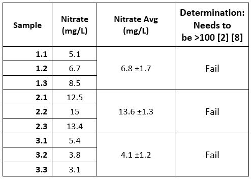 The nitrites/nitrates were tested utilizing TMECC 4.02-B to create the slurry. The slurry was filtered once using a glass membrane filter, and once using a gridded coliform filter. Then, HACH method 8039 was followed to test the nitrates/nitrites with calorimetry using cadmium as a reagent. The test had to be modified due to the lab not having an Ion Chromatograph Dionex DXI20.