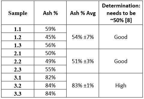 The percent ash test followed TMECC 3.02A Unmilled Material Ignited at 550℃ Without Inerts Removal. 50cm3 of compost was dried at 70℃ for 24 hours before placing into a muffle furnace at 550℃ for 2 hours. The compost weight was recorded before and after the furnace. Ash content is recorded as a percentage from initial dried weight.