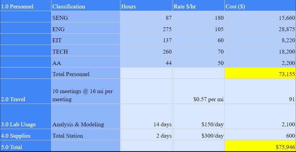The project was projected to cost about $76,000 for all aspects of the design which included personnel, travel, supplies and licenses for the different softwares needed for analysis.