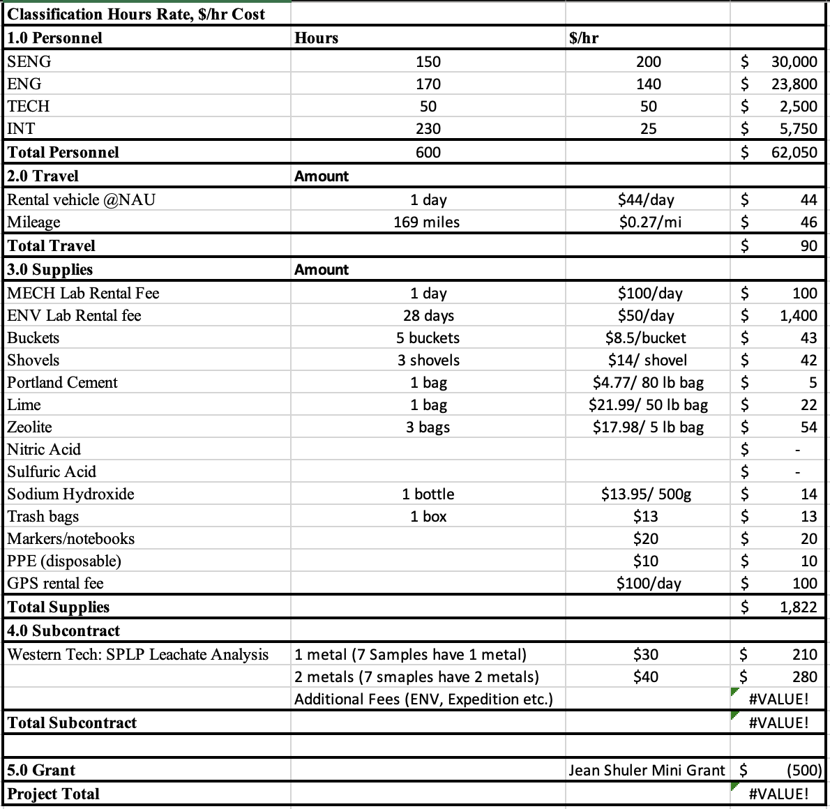 The project cost is $66,412 total after adding up the Personnel, Travel, Supplies, and subcontractor. Personnel costs are $62,050 total. It is expected that the team will only need one day to visit the sites to collect tailings, which will result in a total cost of $90. Expected supplies end up totaling to $1,772. This includes the lab fees, supplies for the day visit, and materials needed for the cement mixture being researched.