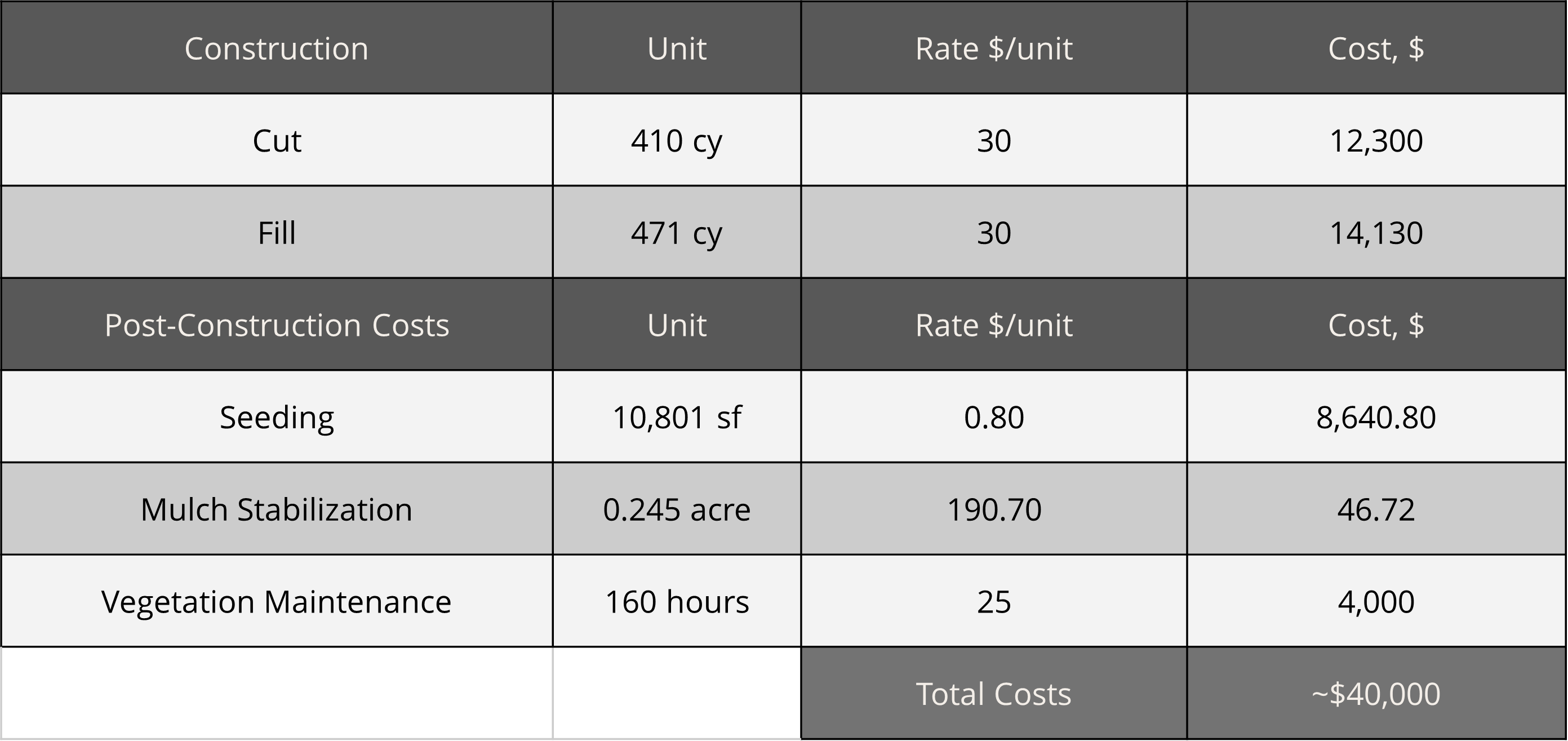 Design alternatives included a feasibility which includes new cross-sections that handle the anticipated bankfull discharges. Four cross-sections were designed to provide the post development grade. The cut and fill of each cross-section was determined. Water surface elevations are also displayed within each cross-section to further emphasize the channel's feasibility.