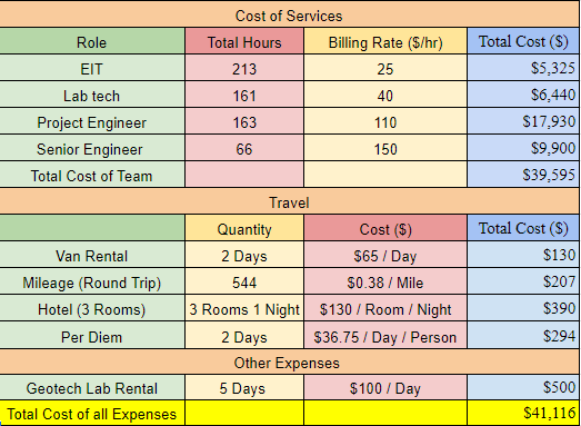 The total cost of the design project is $46,441 as shown in Table 5-1. Table 5-1: Cost of Services consists of the billing rate and hours for each team member working on the project. The cost for other expenses such as travel and food are also included in the total cost of the project. Personal billing rates include salary, overhead and benefits, which means that the table only includes the billing rates given to each role.