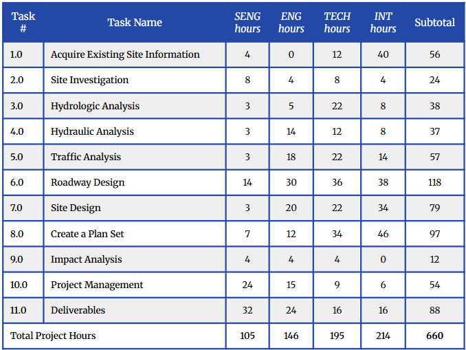 There are four staffing positions, including a senior engineer, a project engineer, an engineering technician, and an engineering intern. The total hours per task and personnel are summarized below in the table below. The projected total for this project is 660 hours.