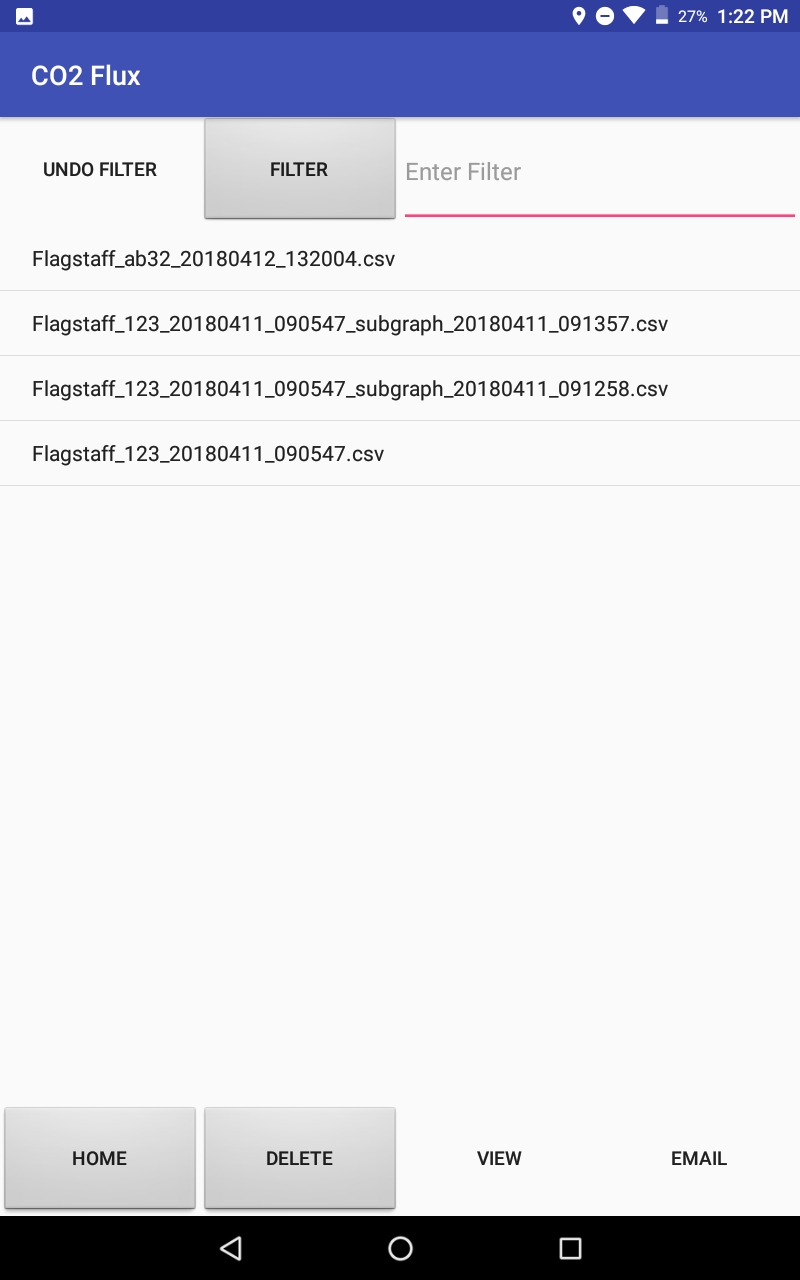 To eliminate the need for additional software, CO2 flux includes multiple operations for Data management and transference. By simply tapping on an item in the File Directory List, the user can choose to either delete the file, review it in further detail, or delete it from memory. In order to email data out of the app, the Android device must have an email application already installed. All files in each data set selected are attached automatically ; the user only has to provide the To address.