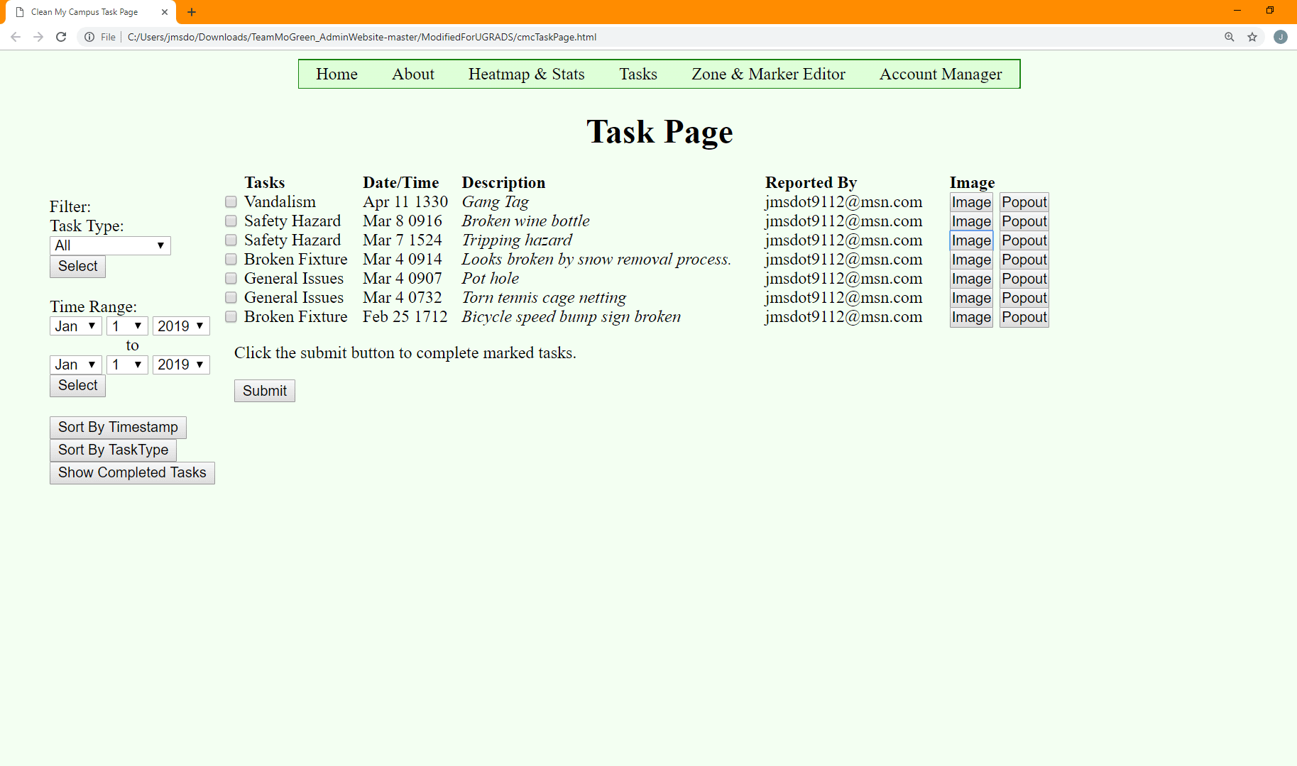 Information shown on Task page include the task, date/time, description, reported by, and image(optional).