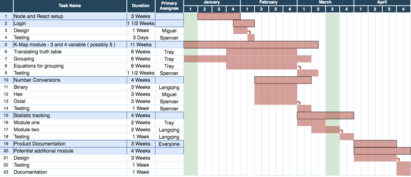 By talking with our client, it became apparent that our solution must be widely accessible as students have varying devices that they use for school work. To make sure we can deliver to as many people as possible, we chose a web application, as they generally use little resources and can work on all operating systems. Next, we must allow the student to practice problems. This means creating questions and activities related to Digital Logic that the student can interact with and solve. Finally, we must track the usage statistics in a database, so that our client can understand areas of the class that students are struggling with. All of these more concrete goals allow us to achieve our final, more abstract goal, to increase students proficiency rates within the course. More information about our high level requirements can be found here.
