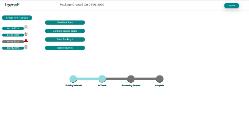 Once the user has submitted their package they are met with this "Metadata" page that allows them to look at the samples they just submitted, generate their sample labels