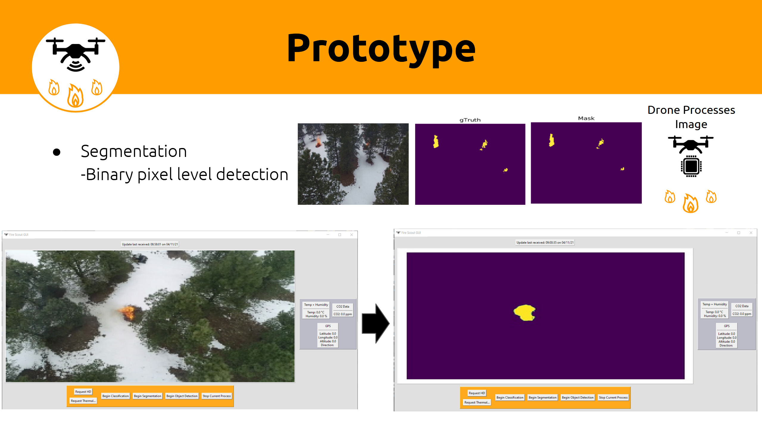 Image segmentation breaks down a photo at the pixel level and seperates the fire from the rest of the image by assigning a different pixel color to the fire.