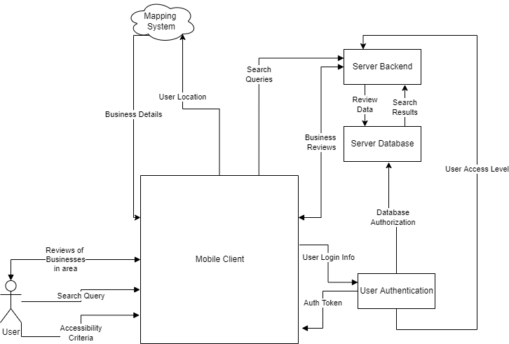 In our system, the user sends their reviews and queries to the mobile interface, which is divided into a client review UI and a client search UI. The authentication system sends a DB access token to the other modules, which they use to either search for businesses or submit a review. The mapping system receives the user's current location and sends a list of nearby businesses to the search UI, as seen in figure 1. The review UI gets the business's ID and category from Google Maps and uses it to submit a review to the server backend, which processes it and inserts it into the database. The search UI submits its requests to the server backend, which queries the database and passes the data back to the client, which presents the results to the user.