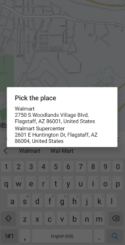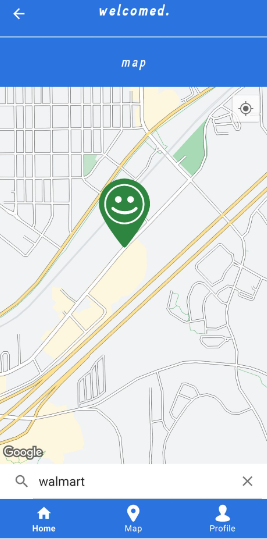 Then, the user searches for a Walmarts near them. They are given different pinpoints on the map. They choose the location with a positive score.
