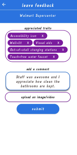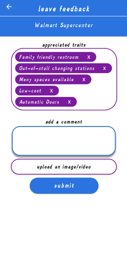 The user is then directed to the Walmart page and can view reviews and traits for this location. They tap "leave feedback" to create a review. The appreciated traits are auto-populated with their preferred traits, so the user can either delete traits or add any as needed, as well as a comment.