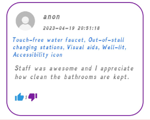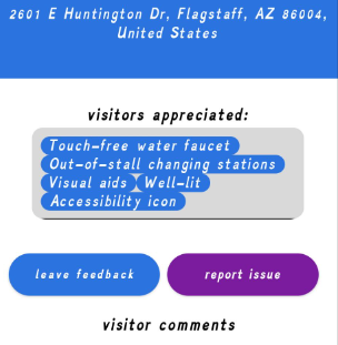 Our project's aim is to create accessible and inclusive interfaces. This application will provide a nuanced source of information about the accessibility of facilities and public locations. This will allow people to easily look up information about specific locations or their current location, and see whether the facilities there meet their needs.