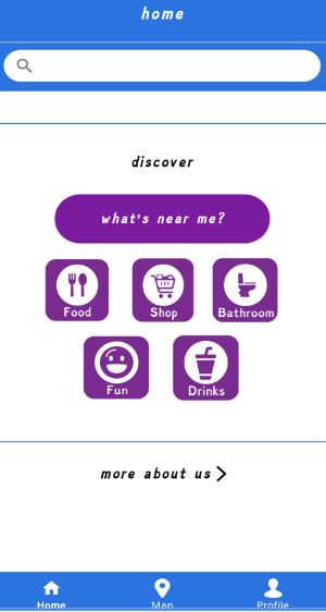After the account is set up, the user is automatically taken to the home page. Here, you can discover new places near you. You can also tap "more about us" and read our mission statement, as well as learn more about the Dylexiefont.