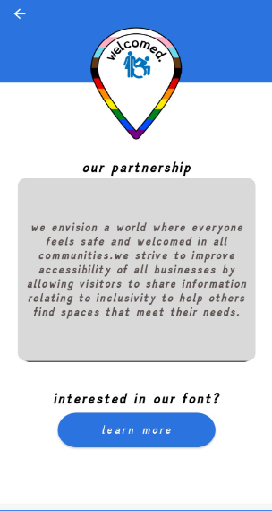 The goal of our project is to create a platform that helps people of all backgrounds and disabilities feel more included and able to access information about local businesses. This platform, which will be a secure mobile app, will allow people to share information about which businesses are able to meet their specific needs.