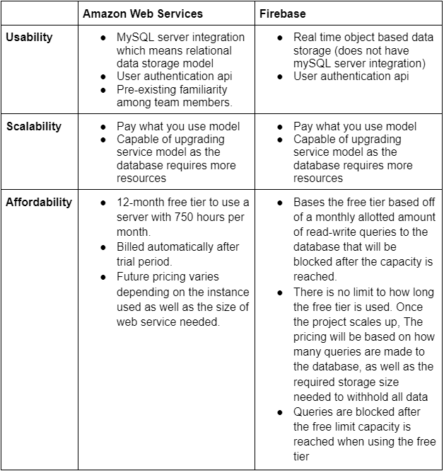 The use of a relational database makes Amazon Web Services the best option for our project. This type of database allows for data from various sources to be easily integrated and used to create demographic information, which is critical for our client's needs. In contrast, Firebase's object-based data storage may limit the ability to perform these functions. Furthermore, AWS is likely to be more cost-effective as the project grows and scales.