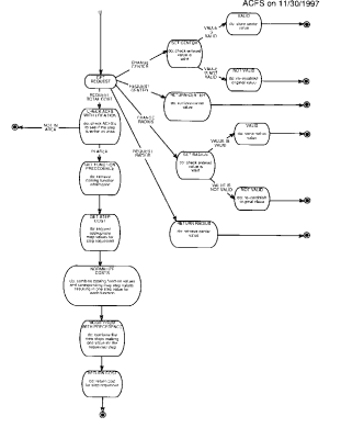 2.3.2.3.2 Route_latest The Get Action state is used as a dummy state, where the requests for information from the ACFS are processed. The state transitions can be broken into four types: basic, request route, clear all, and change. Basic includes requests such as Get Finish and Display Route, which consist of one transition from Get Action to the state and back. Change is only slightly more complicated, consisting of a validation step and then two states called Valid or Not Valid on the transition back to Get Action. Clear All is straight forward with transitions to each next state only dependant on successful completion of the action at the previous state. Request Route has a straight forward path, that is complicated by the capability of the user to cancel and return to Get Action at any state.
