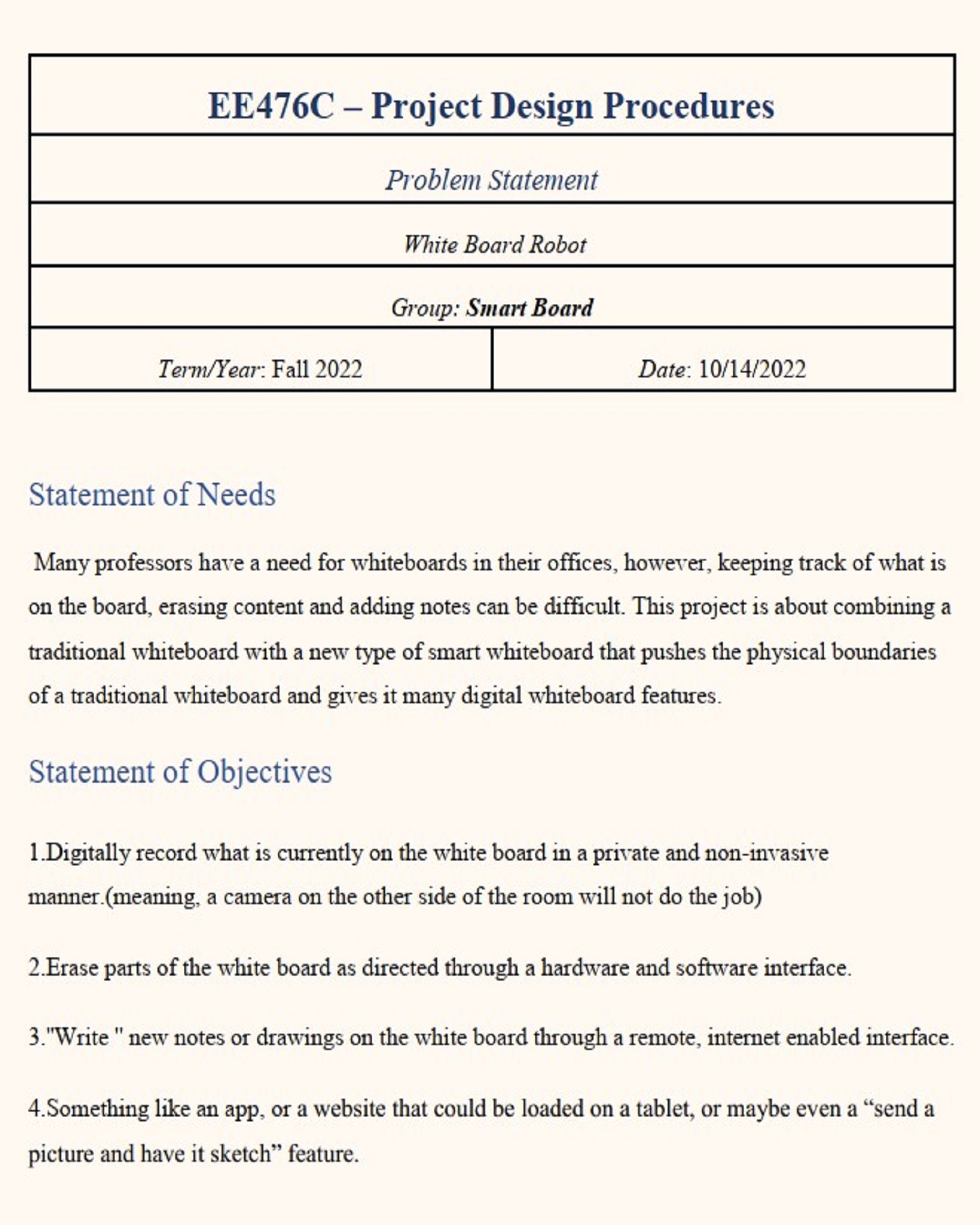 This project is about combining a traditional whiteboard with a new type of smart whiteboard that pushes the physical boundaries of a traditional whiteboard and gives it many digital whiteboard features, which can keep track of what is on the board, erase content and add notes. The Smart Board team is working to push this project forward. As the Electrical engineering team, we have to provide a solution to this project by designing an electrical control system to operate the stent for the motor.