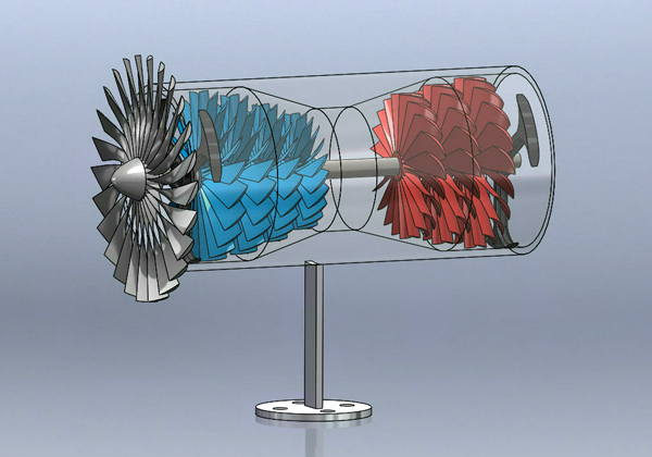 We are creating a turbo-fan engine that demonstrates the Brayton cycle. This unit has an aluminum mount that will measure a thrust force from a canitlever beam deflection using strain guages.