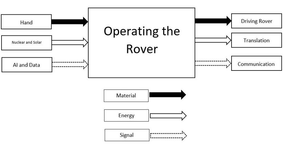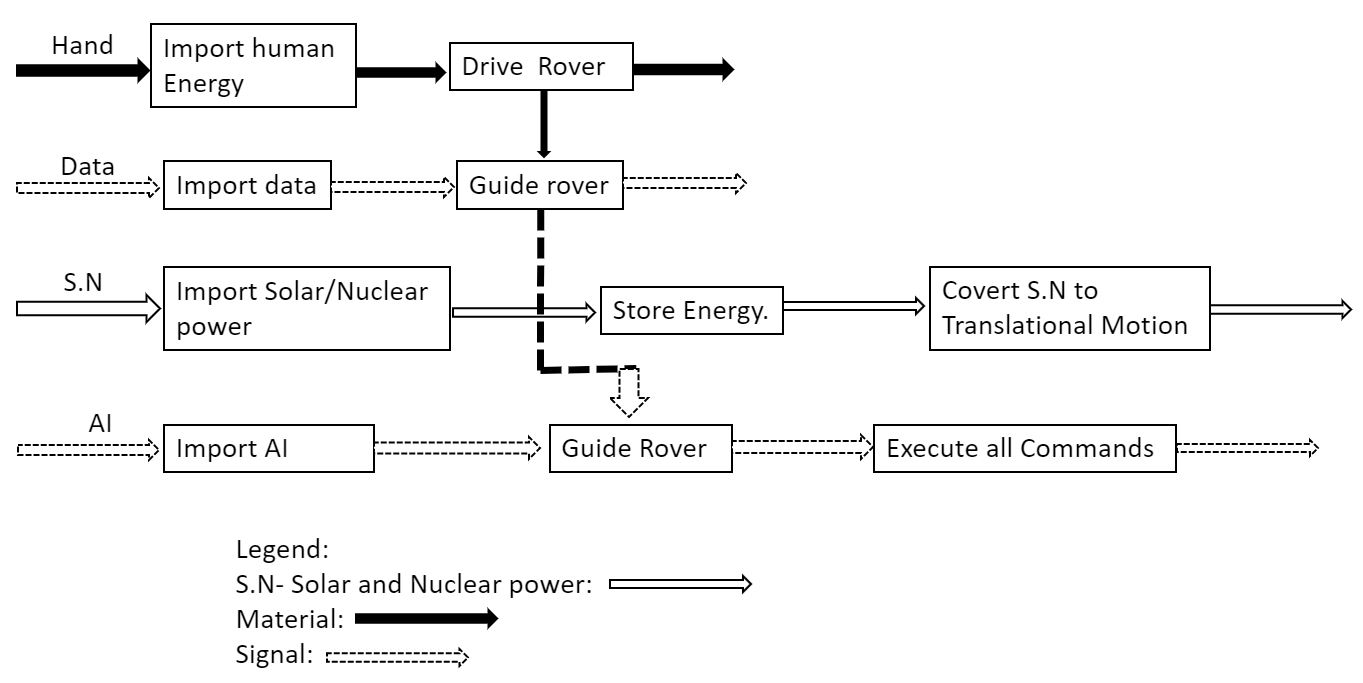 This black box model consists of materials (solid arrow), energies (hollow arrow), and signals (dashed arrow). This model was critical to help the Psyche Capstone Team visualize the necessary systems for the rover.