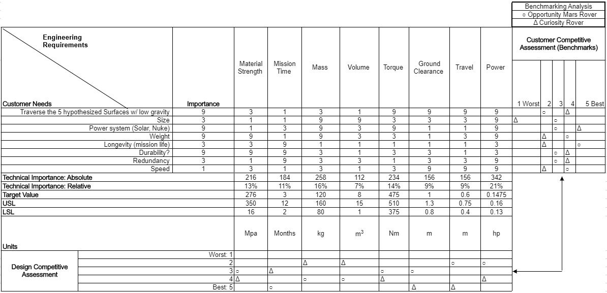 The QFD identifies, relates, and ranks the customer needs to the engineering requirements. Each of the customer requirements were ranked against the engineering requirements on a scale of 1-3-9 to calculate the relative technical importance of each parameter, with one being the least important, three average importance, and nine most important. Based on the results displayed in the QFD, the team’s focus is on the power system, size of the rover, and torque output of the motor.